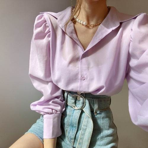 Lapel Single-breasted Loose Casual Lantern Sleeve Shirt Blouse Women