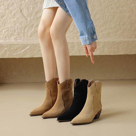 Pointed Toe Chunky Mid Heel Booties Fashion Matte Leather Boots - Mubimart