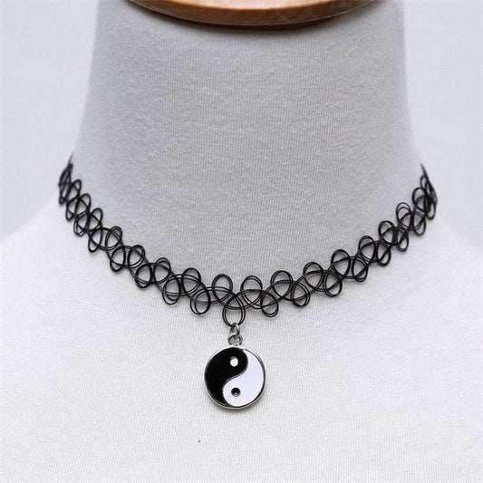 Black Plastic Choker Necklace Women Elastic Tattoo Chokers Gothic Punk Yin Yang Pendants 90s Chocker