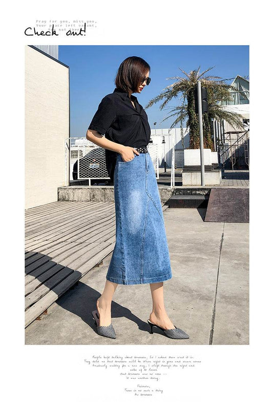 Plus Fat Plus Size One-Step Split Denim Skirt Mid-Length Female Skirt High Waist Bag Hip Long Skirt