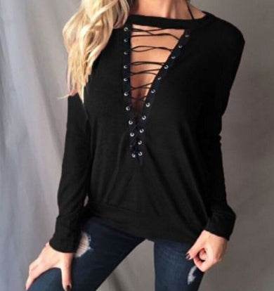 Large Size T Shirt Women Lace up Tops Bandage Long Sleeve V Neck Shirts