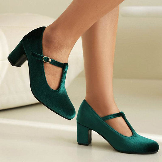 Modische High Heels mit T-Schnalle und Blockabsatz aus goldenem Samt für Damen