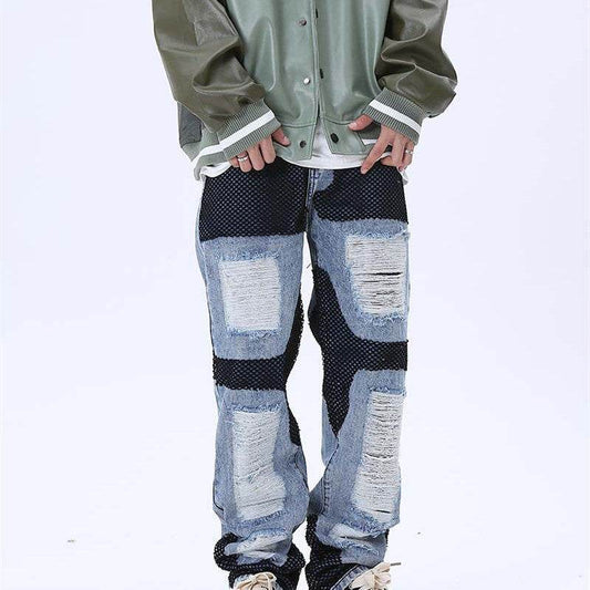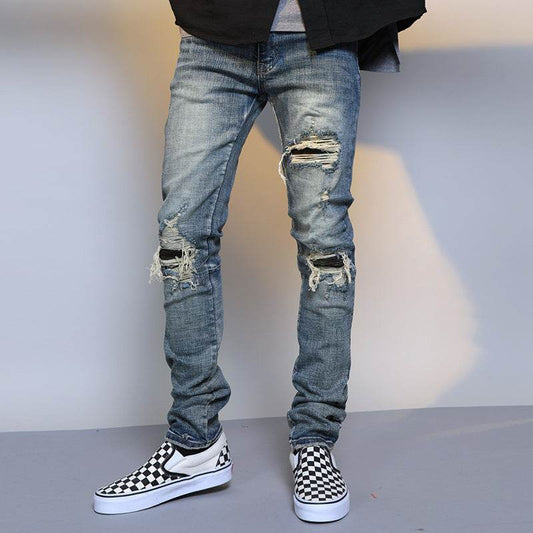 Herrenhose mit individuellen Patches, lange, eng anliegende, gestapelte Jeans für Herrenbekleidung
