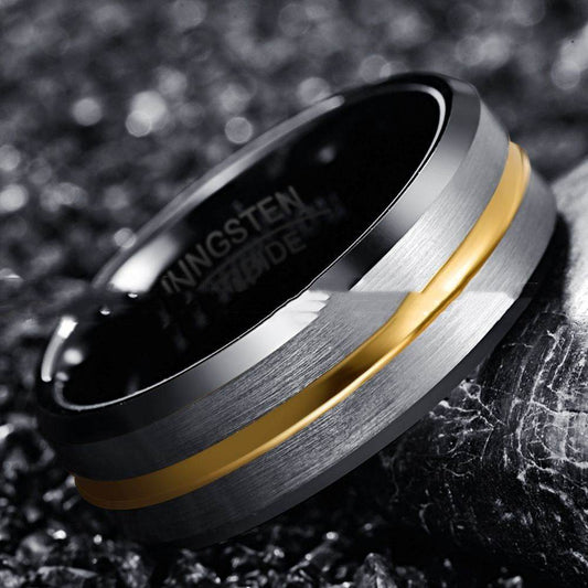 Herren Eheringe aus Wolframkarbid, 8 mm, goldfarben, gebürstete Mitte, zwei Rillen, abgeschrägte Kante