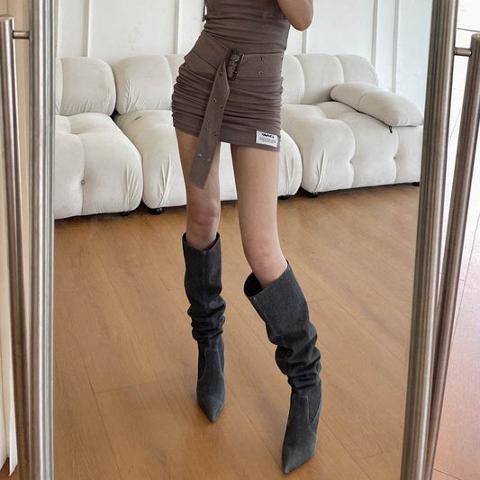 Western-Cowboystiefel mit Quastenverzierung und hohem Absatz unterhalb des Knies