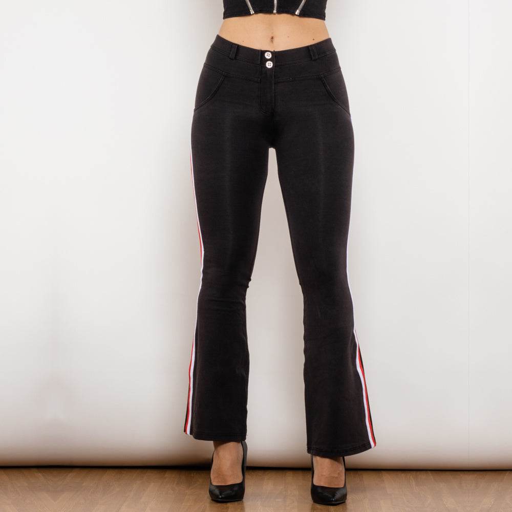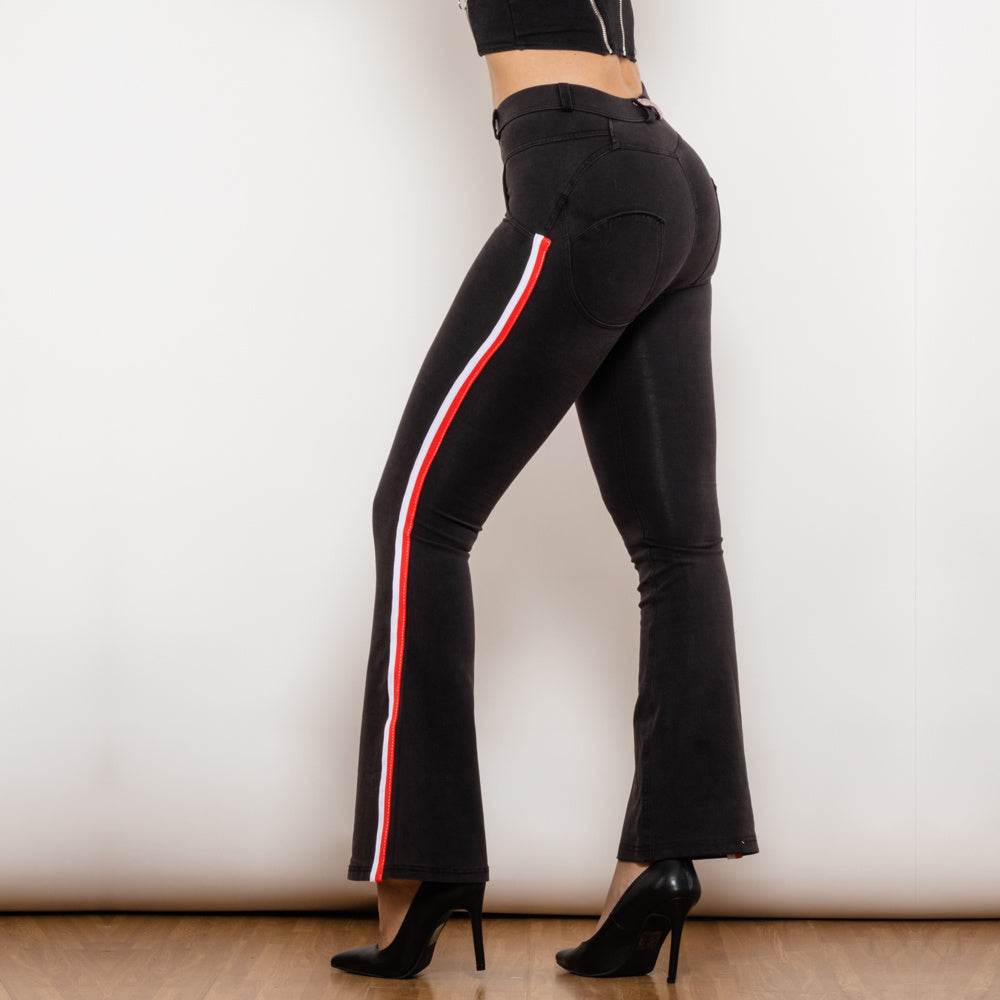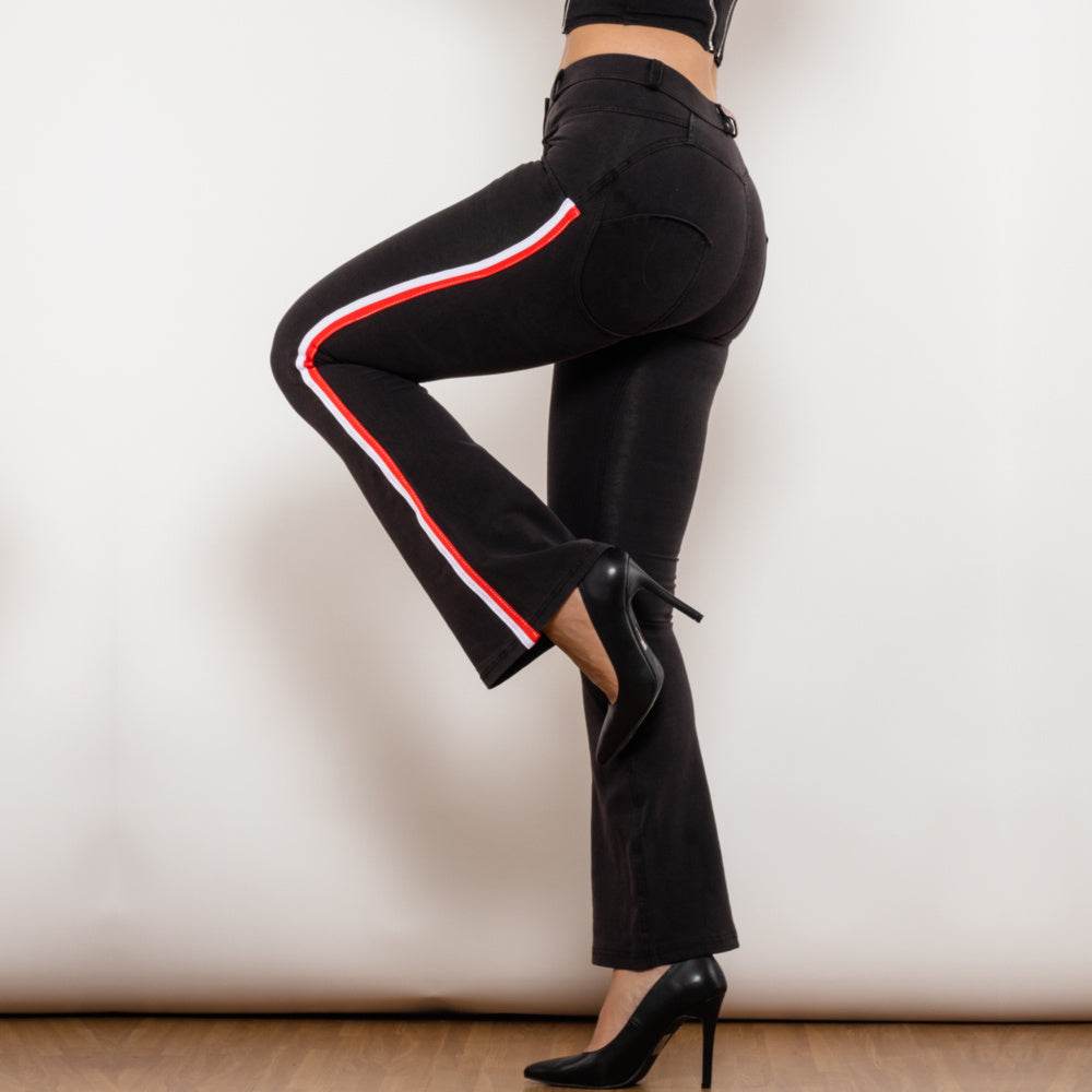 Shascullfites Melody Schlagjeans mit Seitenstreifen, Stretchhose, schmale Po-Lift-Schlaghose, Scrunch Bum, schwarze Jeans