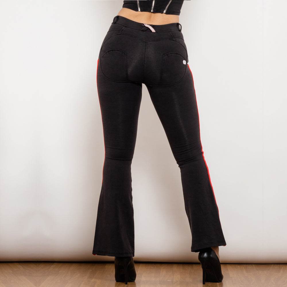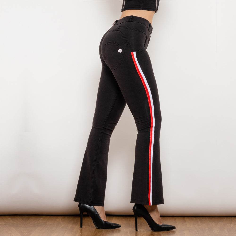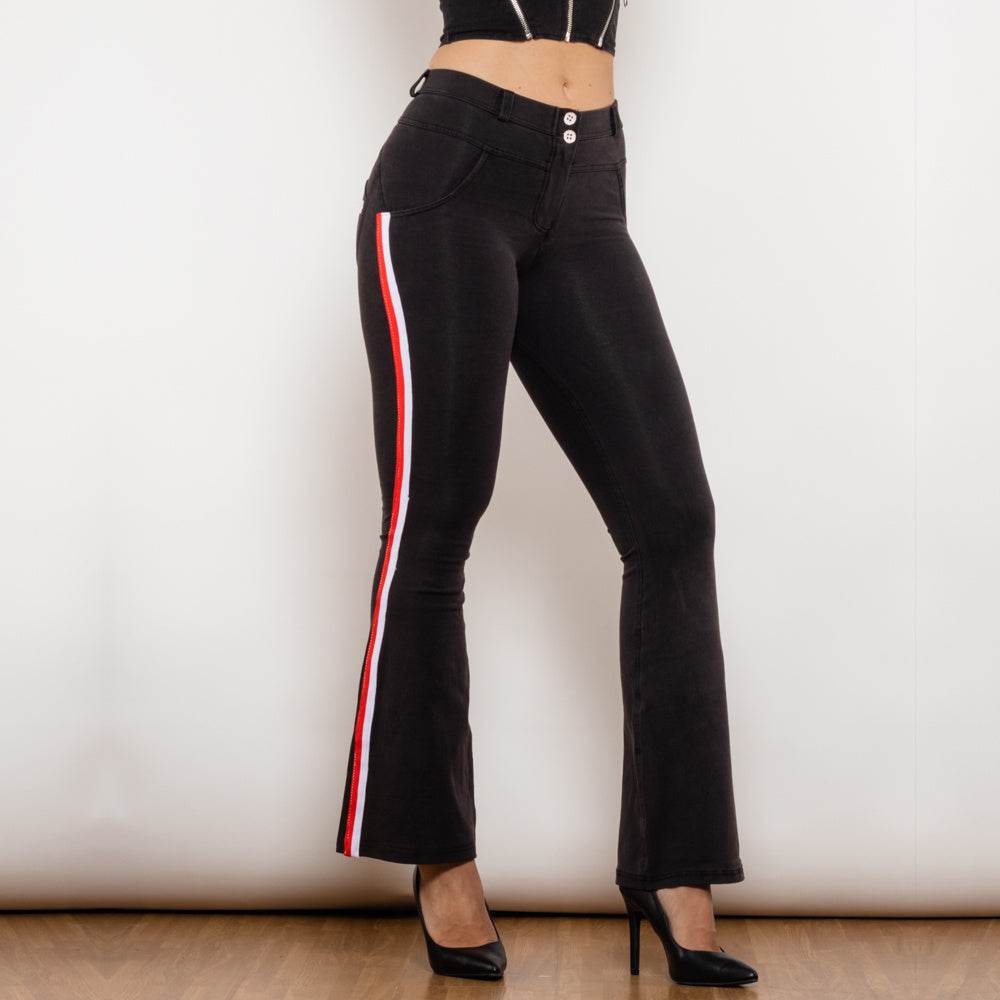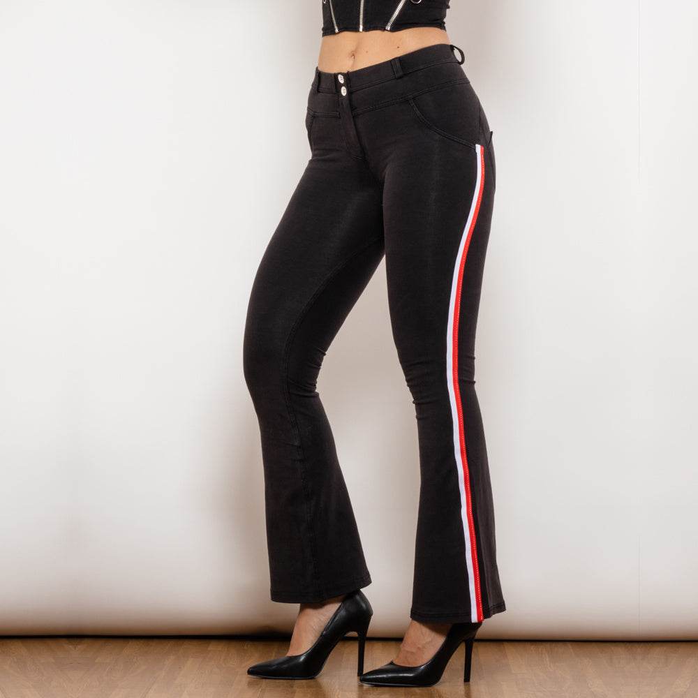 Shascullfites Melody Schlagjeans mit Seitenstreifen, Stretchhose, schmale Po-Lift-Schlaghose, Scrunch Bum, schwarze Jeans