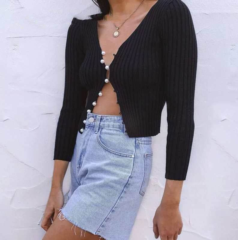 Sleeve Slim Fit Crop Tops Brief Solid Women Knit Shirt