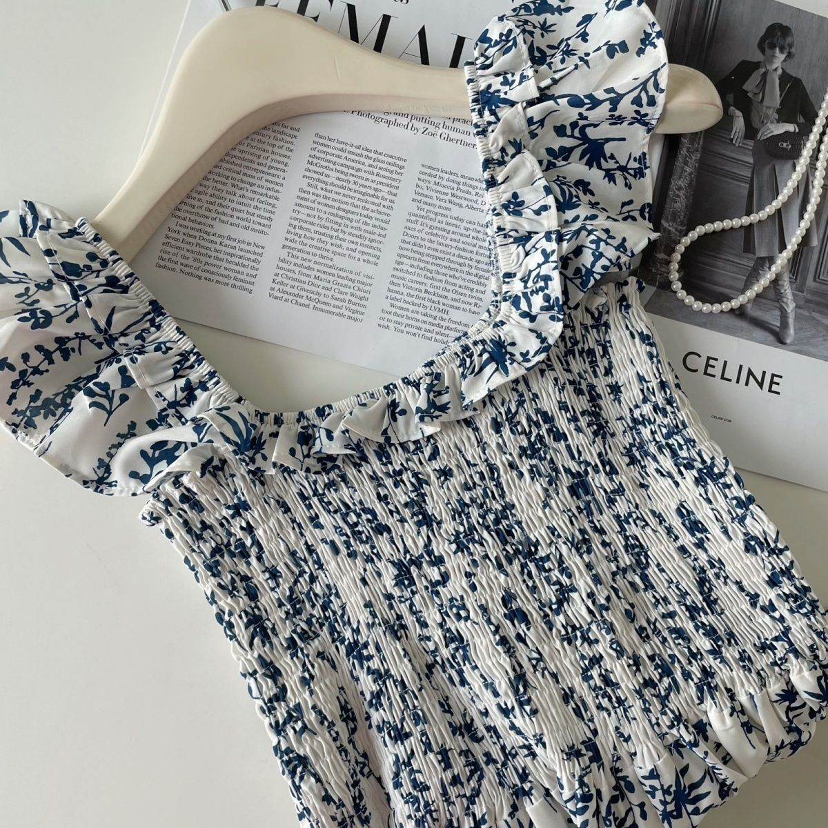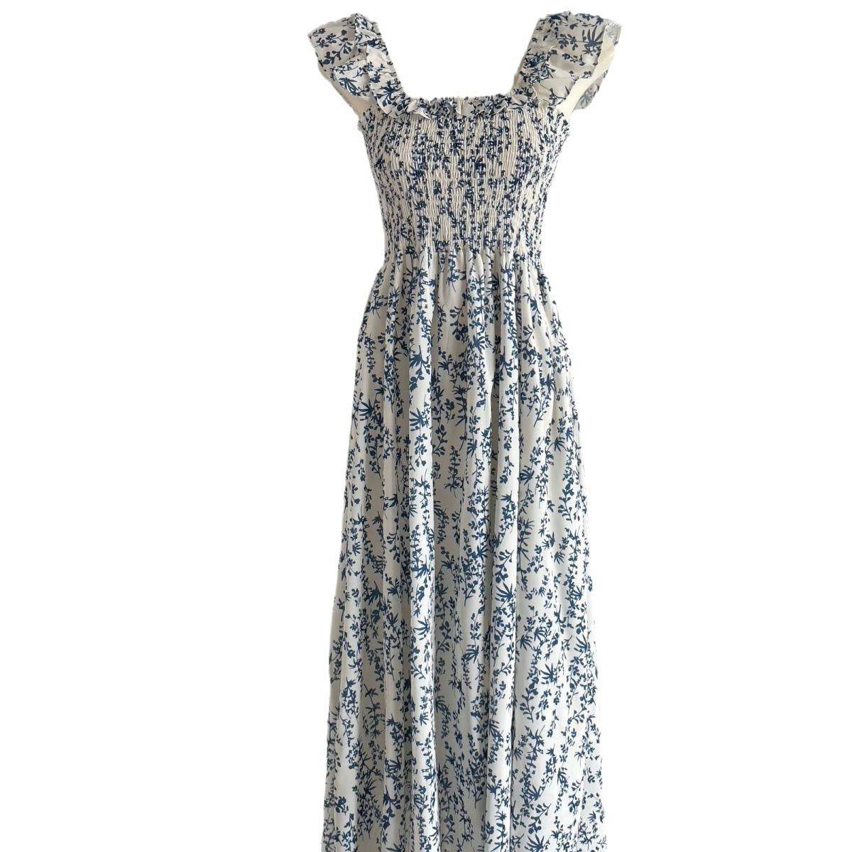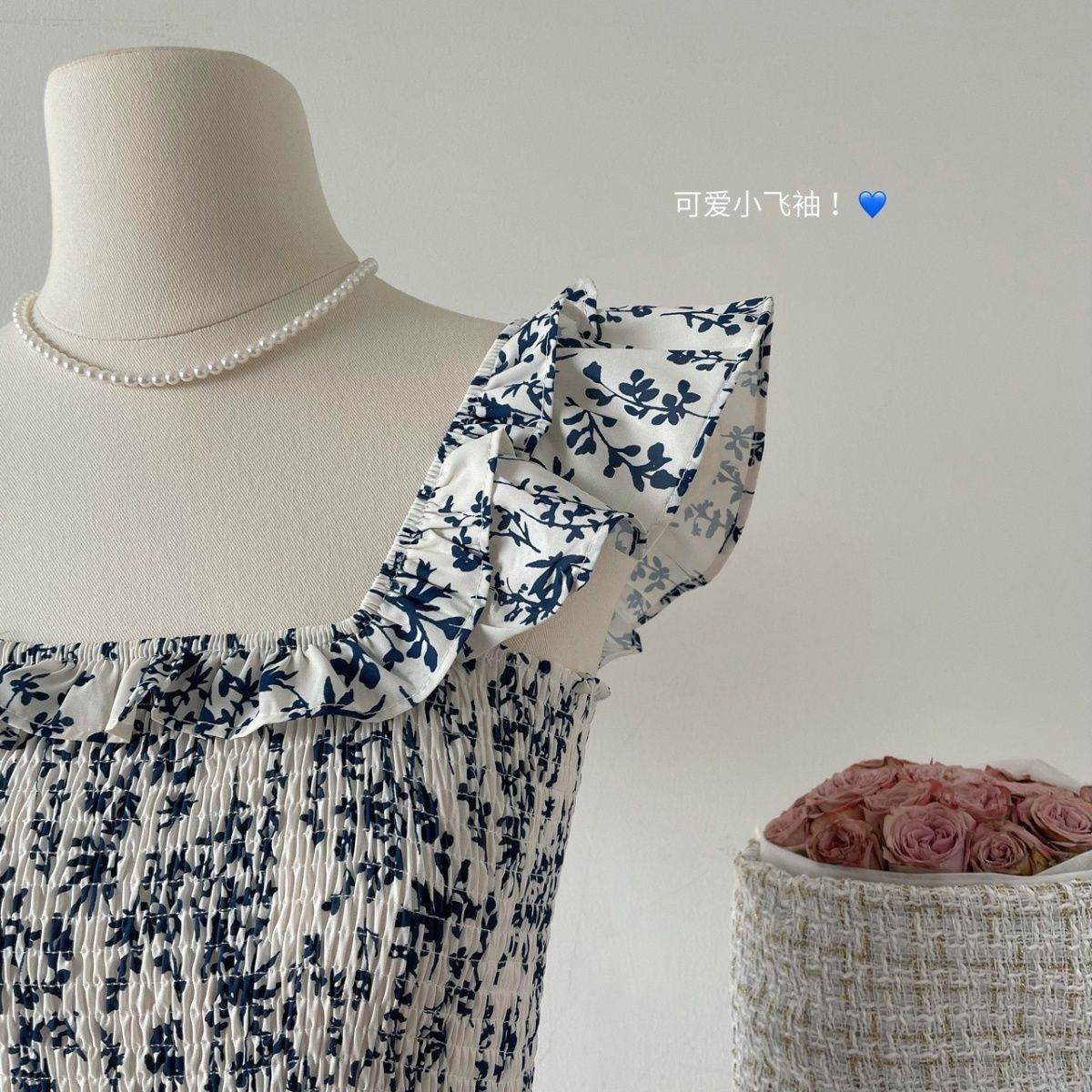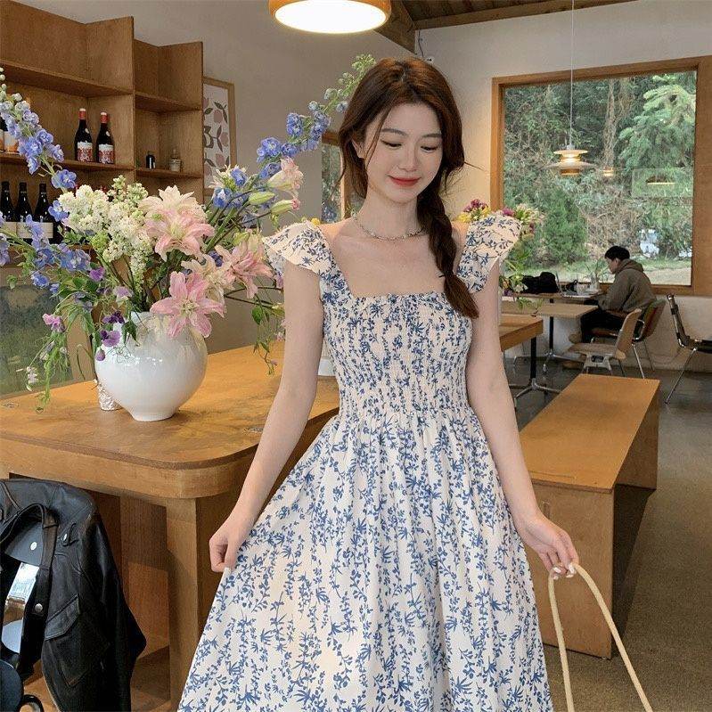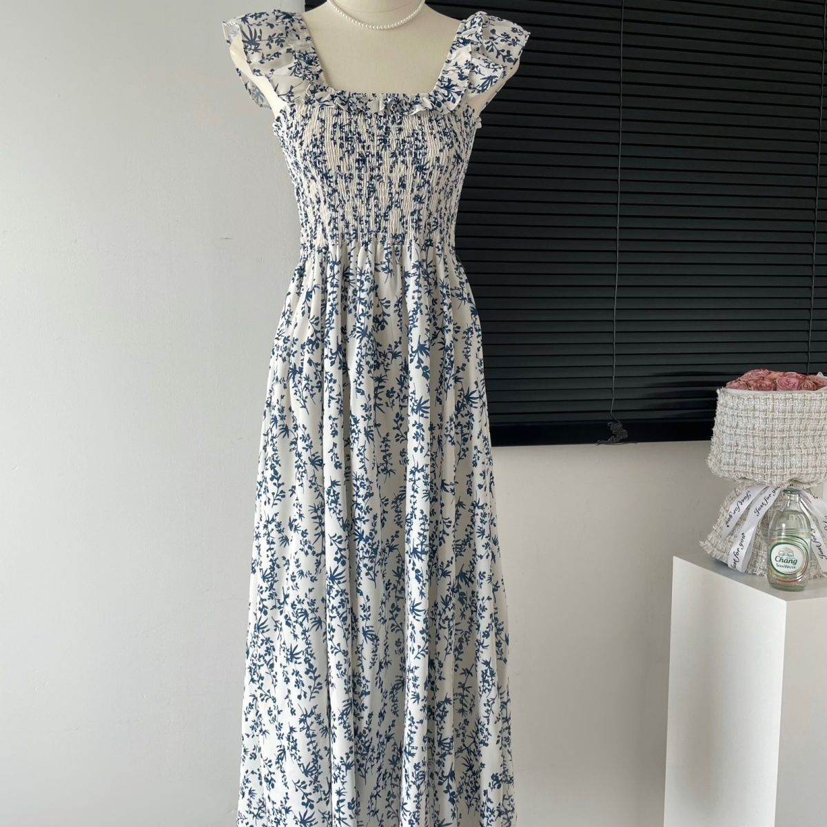 Blue Floral Slip Dress Flying Sleeve Vacation Dress