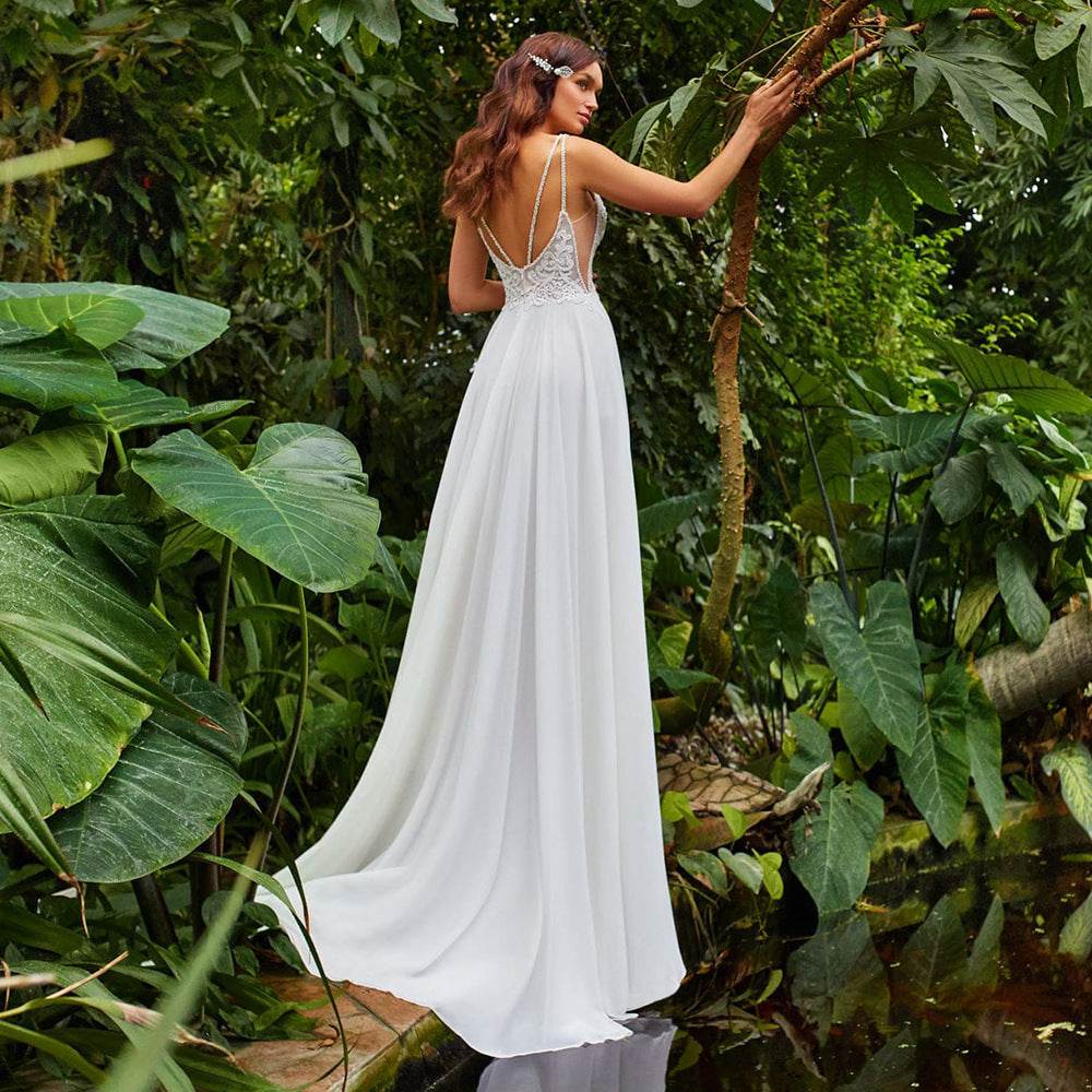 Sexy Side Slit A-Line Wedding Dresses Boho Beading Spaghetti Straps Sleeveless Lace Appliques Backless Chiffon Bridal Dresses