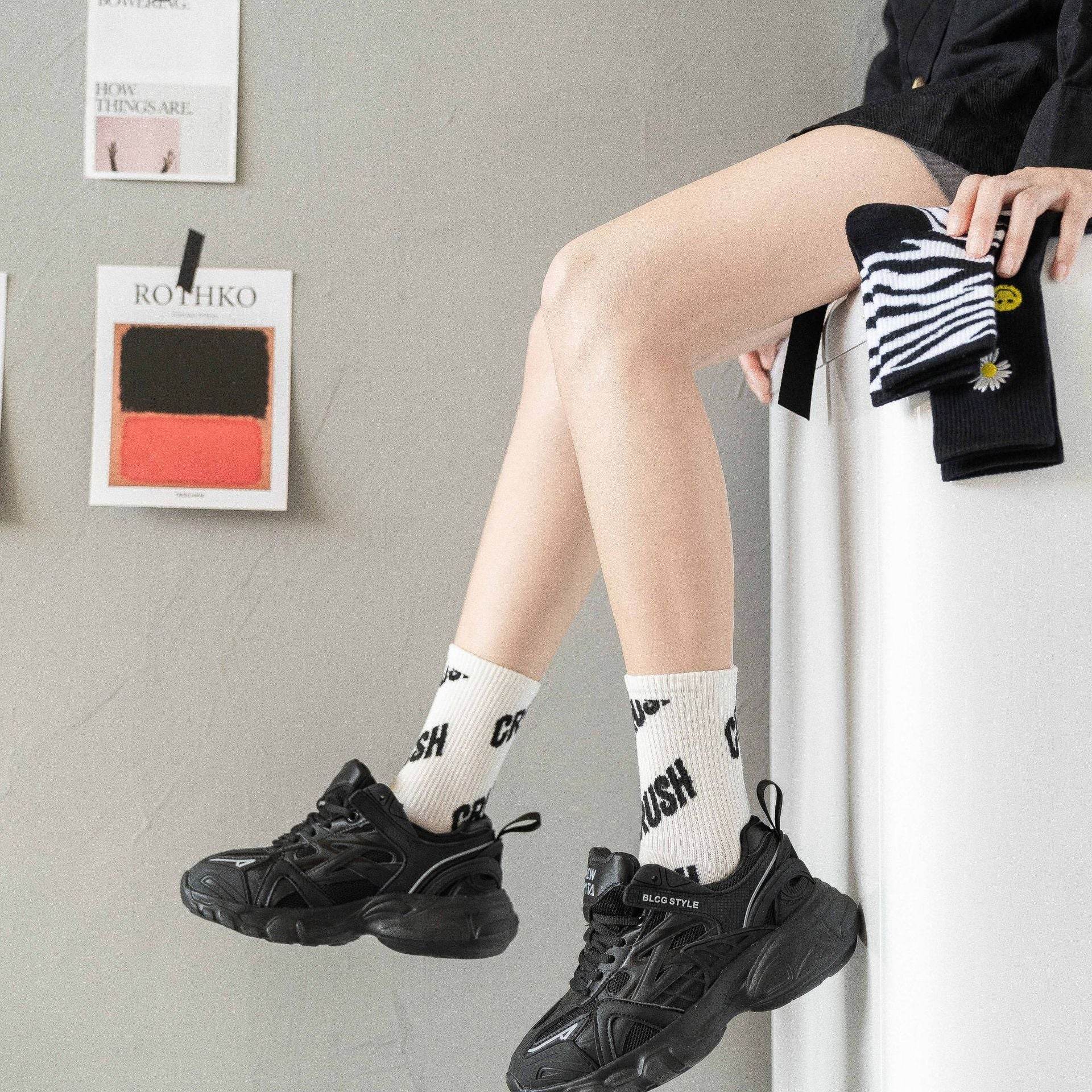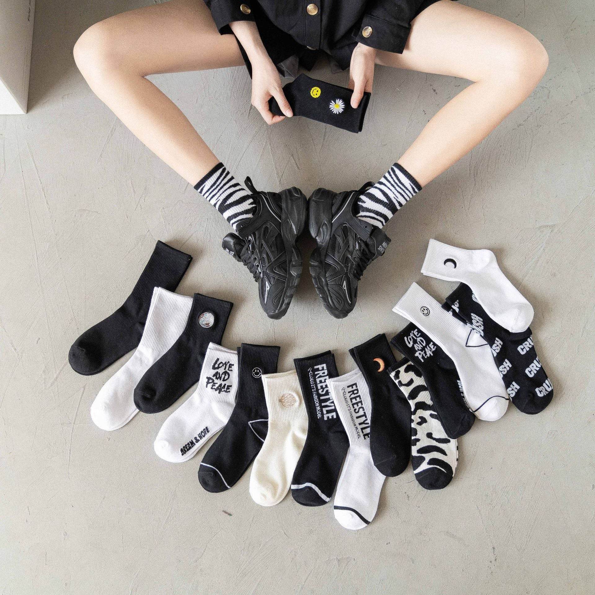Black And White Socks Embroidered Planet Socks Men And Women Couple Athletic Socks Ins Hip Hop Cool Fashion Cotton Tube Socks