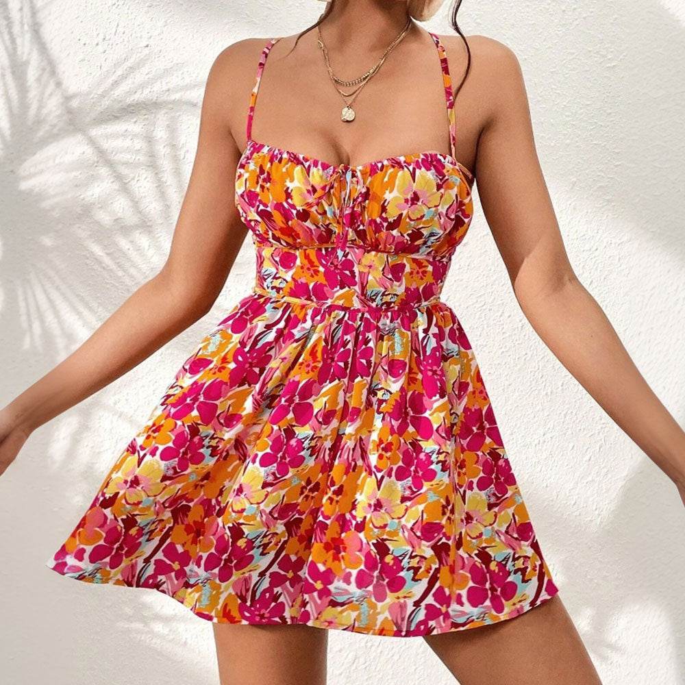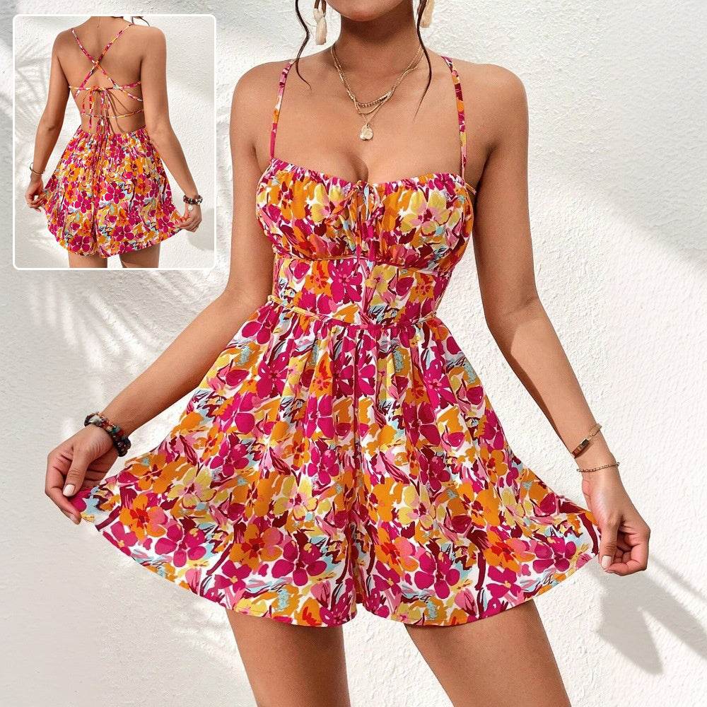 Women's Floral Print Dress Summer Lace-up Back Seaside Holiday Short Dresses