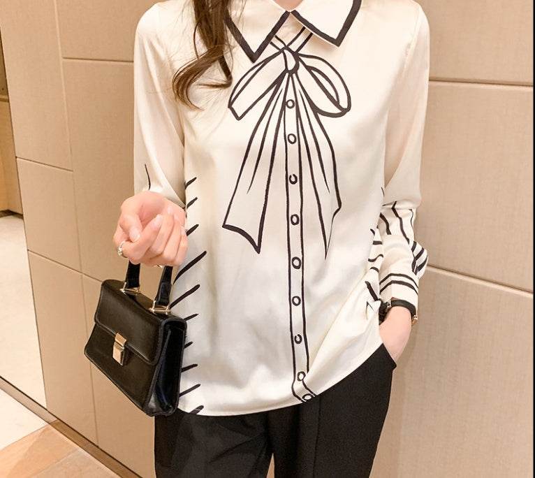 Silk Blouse Women Fake Bow-knot Printing Blouse Satin Silk Long-sleeved Shirt