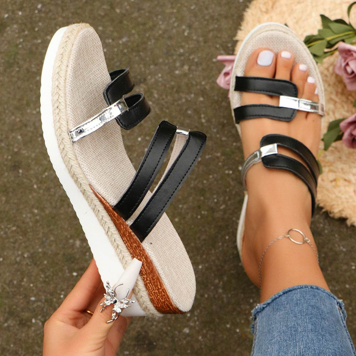 Colorblock-strap Wedges Sandals Summer Fashion Hemp Heel Slides Slippers Outdoor Thick Bottom Fish Mouth Shoes For Women