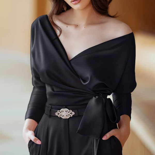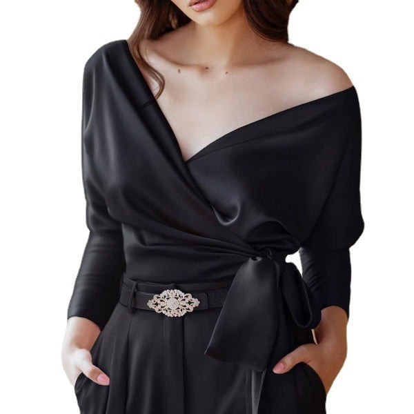 European And American Womens V Neck Solid Color Lace Up Blouse
