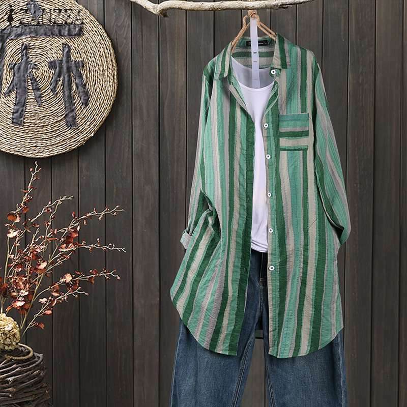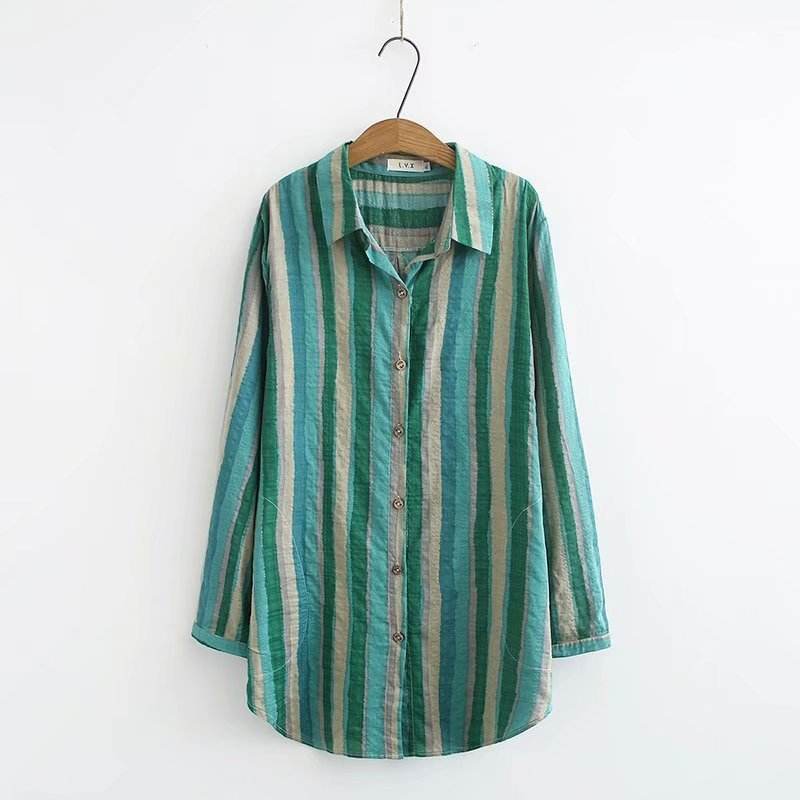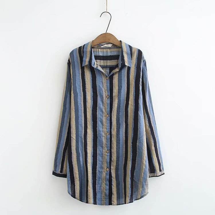 Women Autumn Stripe Lapel Neck Blouses Loose Tops
