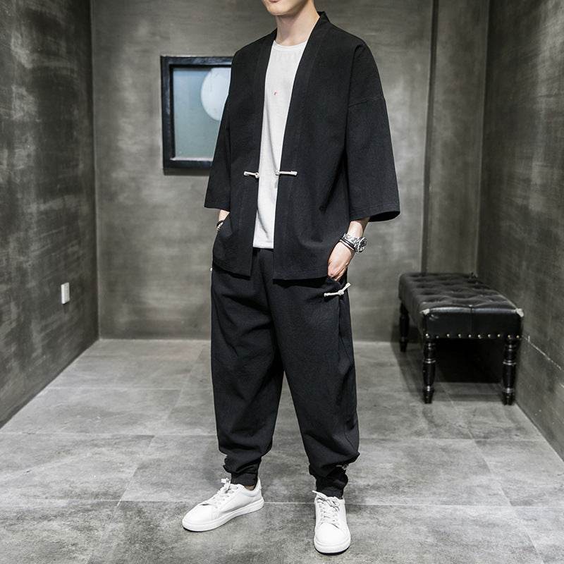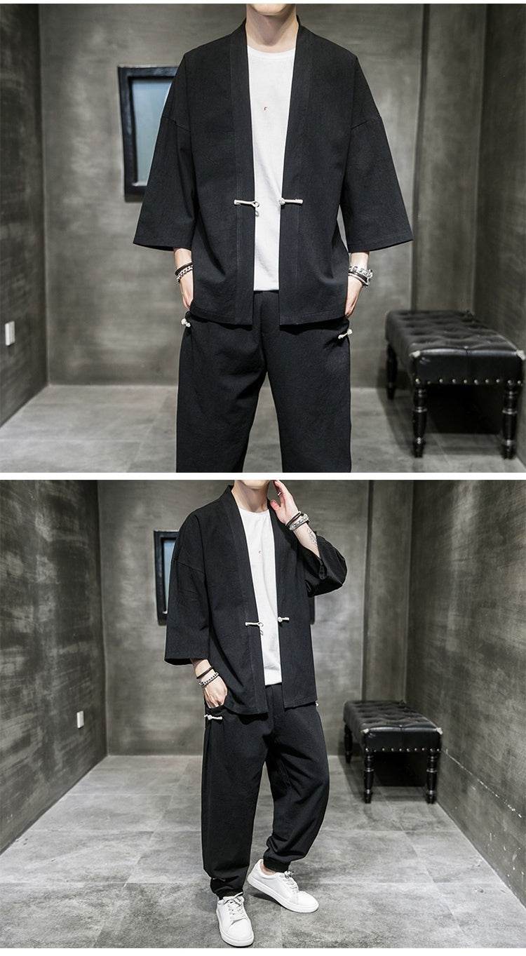 Costume d'été en lin de style chinois pour hommes, manches trois-quarts, robe Hanfu ample, vêtements de protection solaire, grande taille, costume Sang pour hommes, cardigan