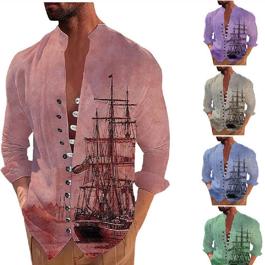 Chemise boutonnée à manches longues et col montant pour homme, imprimé vintage 3D, motif voilier