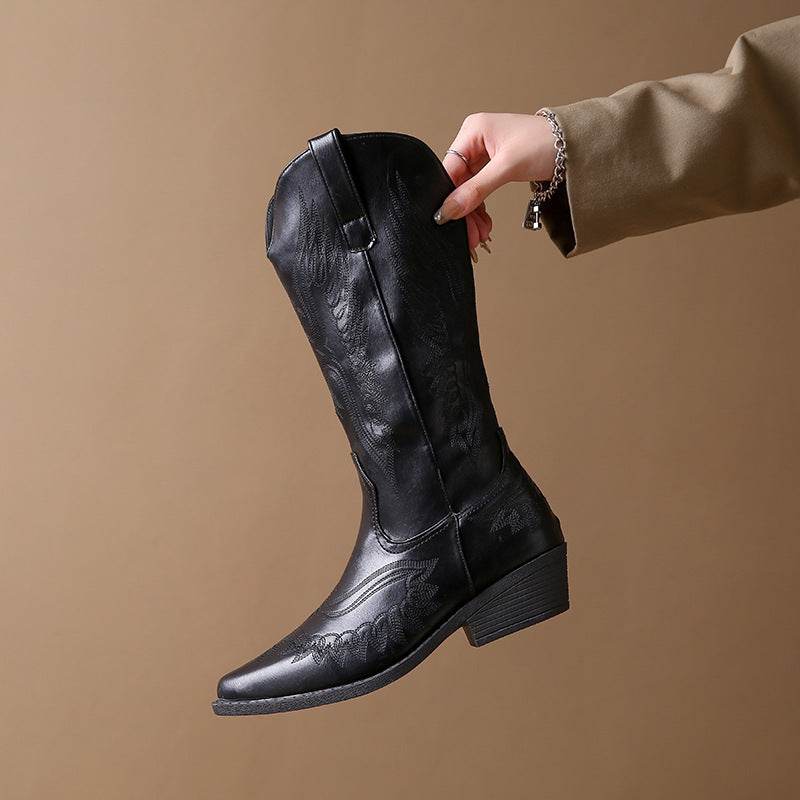 Bottes de cowboy western brodées à la mode pour femmes, pointues, mi-mollet