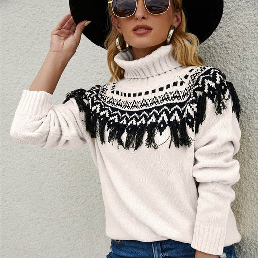New Cross-border Amazon Fashion Pullover Plus Size Ladies Tassel Knitted Sweater European And American Turtleneck Sweater - Mubimart